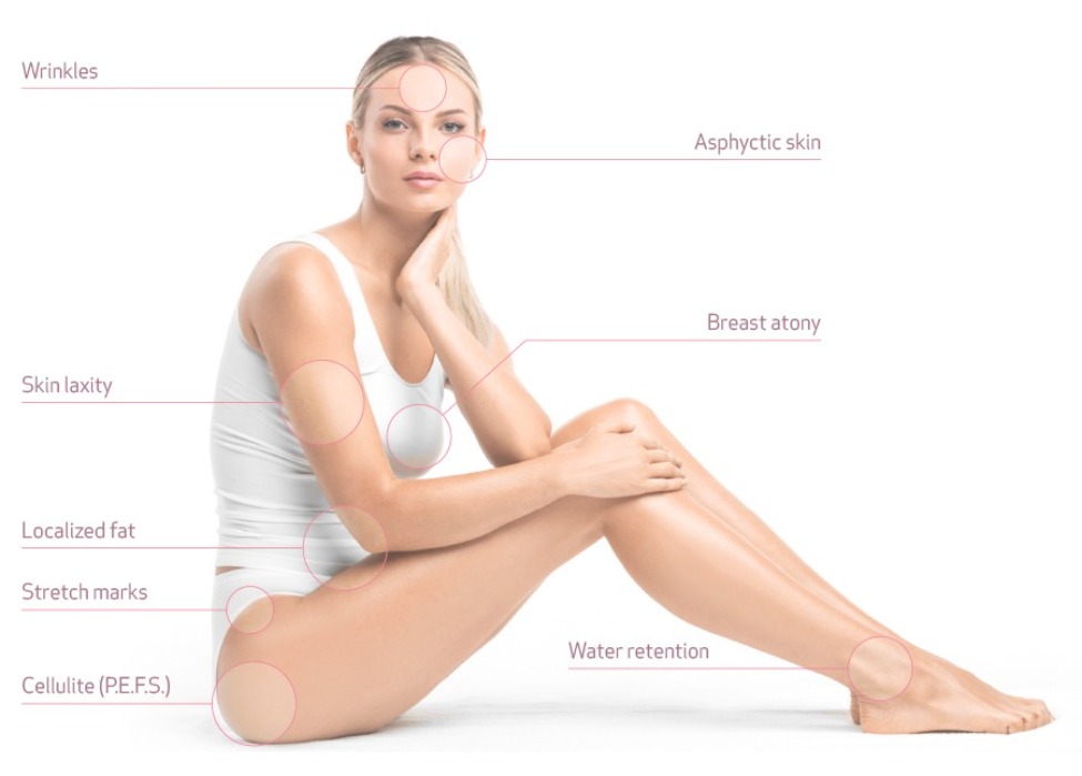 It is particularly suitable for: anti-cellulite treatments, skin tightening, body contouring and anti-aging facial treatments.
